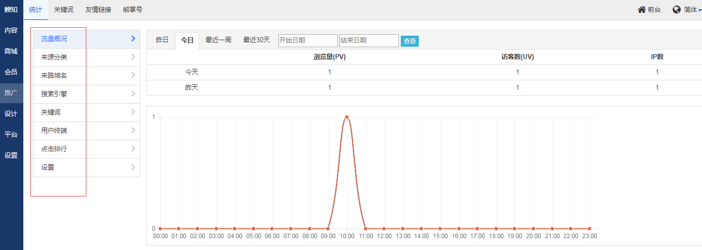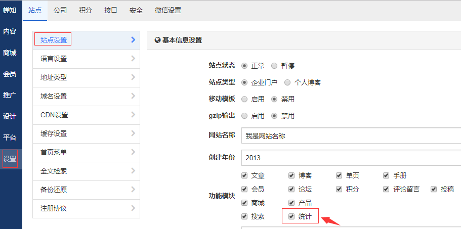 要使用流量统计功能,需要先到后台设置→站点→站点设置的功能模块里勾选开通。