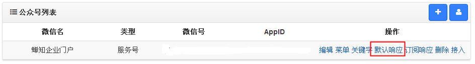 和前面一样,还是使用管理员登录蝉知后台,进入站点--微信管理,选择某一个微信,点击默认响应: