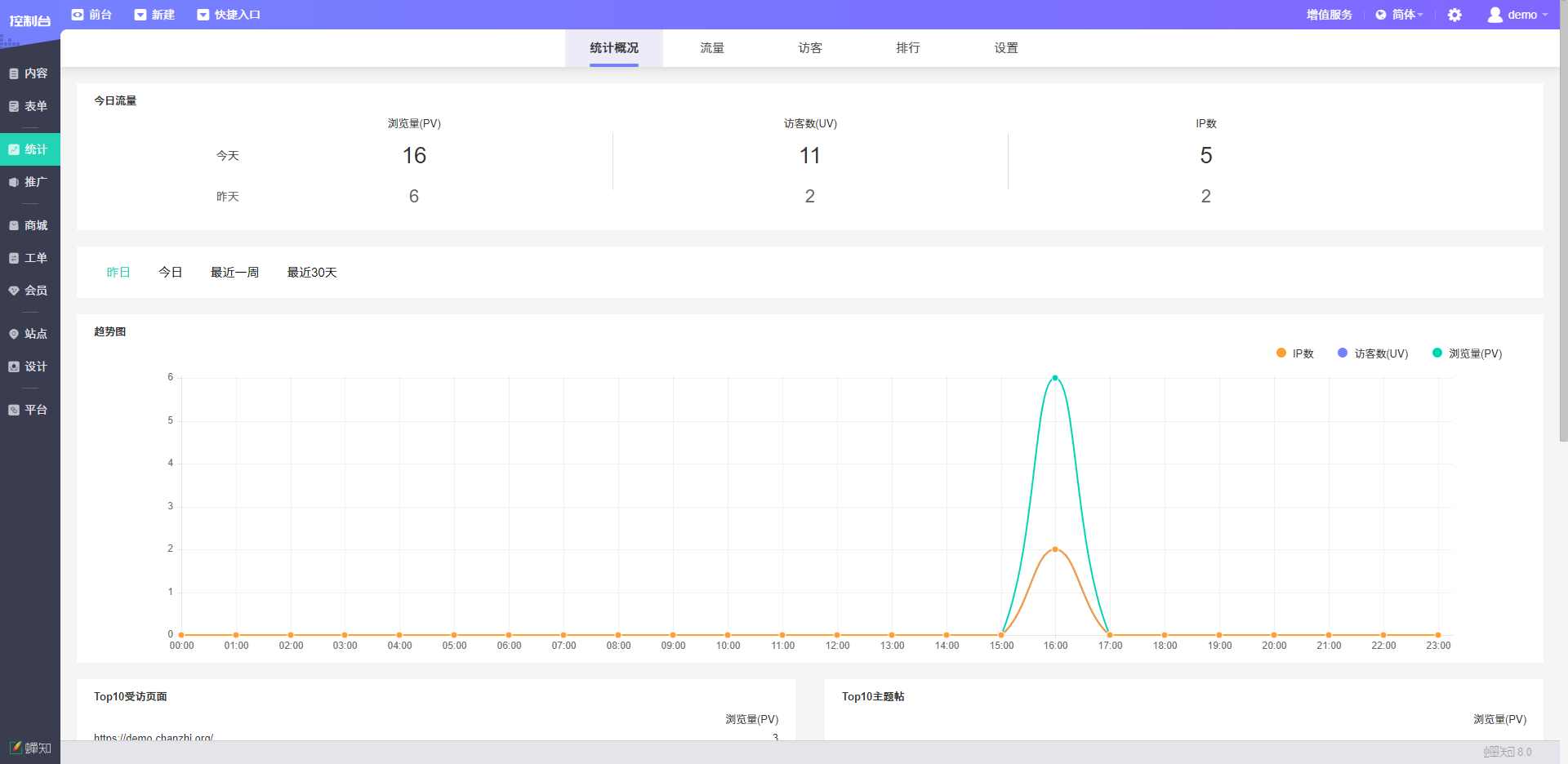 1. 新增统计概况功能 直观反应今日、最近一周、最近30天的流量趋势图增加网站TOP102. 商城新增订单概览功能 通过筛选条件展示30天内的订单量