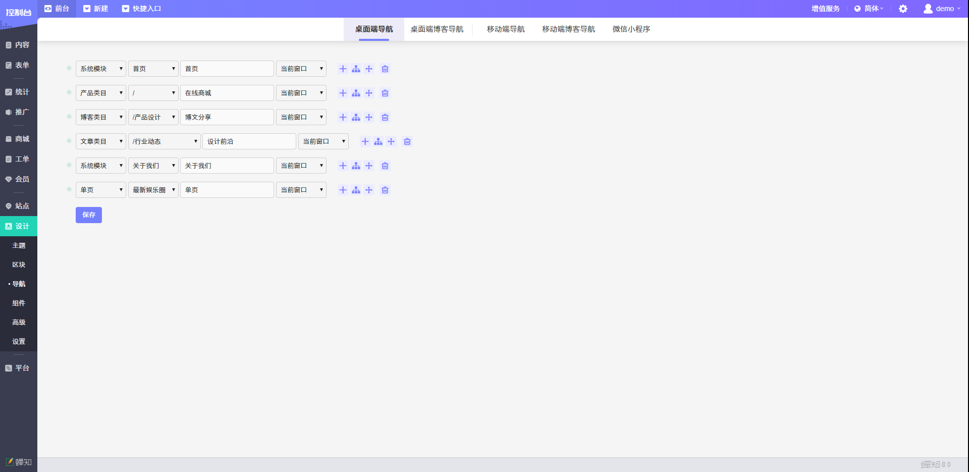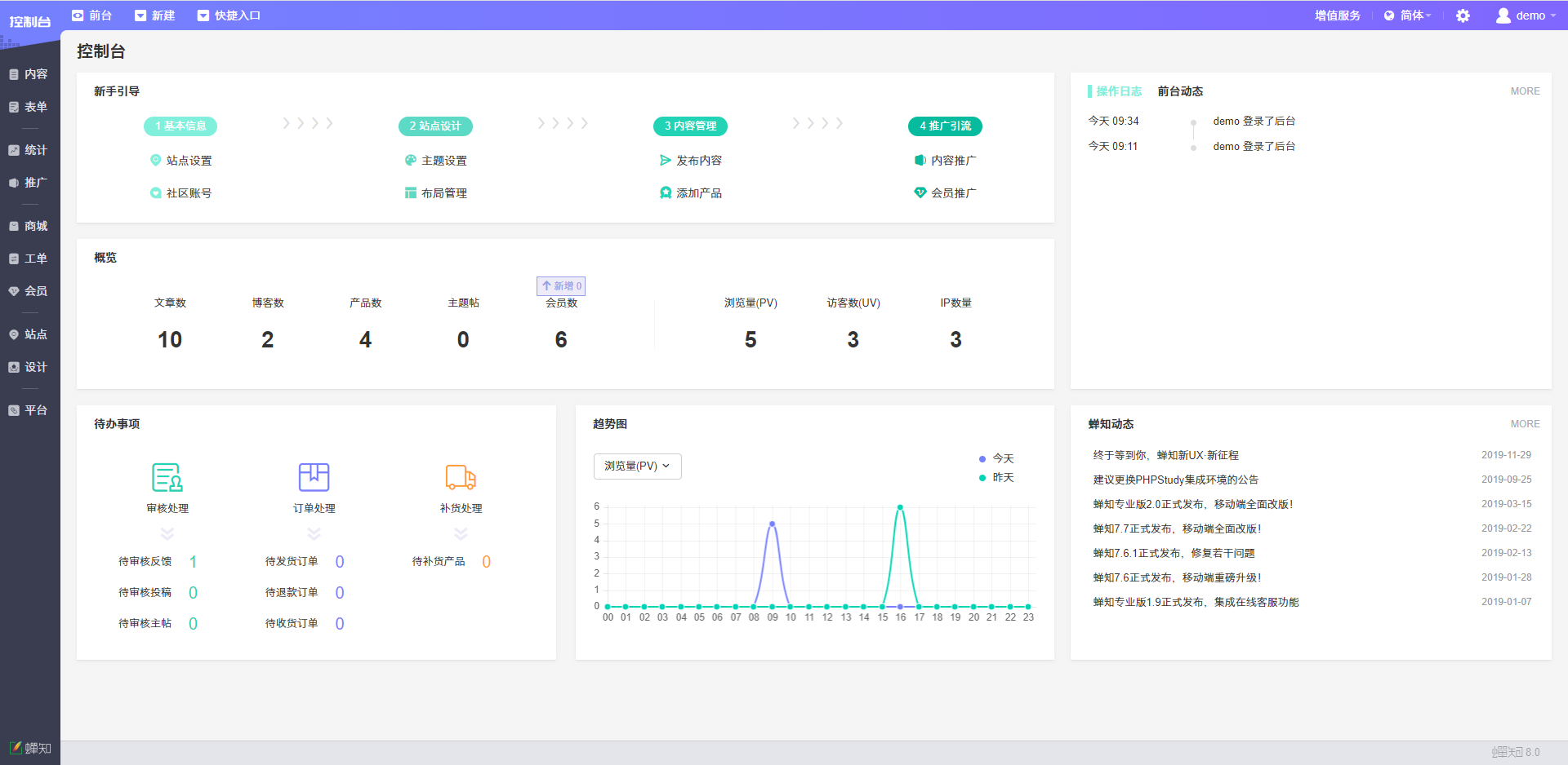 1. 后台首页优化 增加新手引导 动态日志 待办事项 网站概览 网站统计等模块2. 全新的导航栏体系