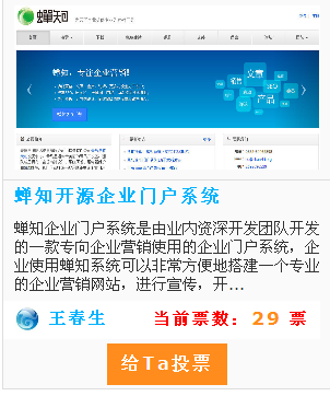 蝉知企业门户系统已经报名参与OSChina-MoPaaS 应用开发大赛,现在已进入前十名,感谢已经投票的朋友对蝉知的支持。