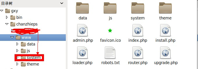 为了安装方便我们将系统分成了两个目录:系统入口目录www和系统程序目录system