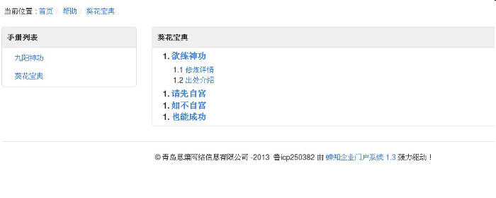 蝉知的帮助功能由手册、目录、文章三部分组成。非常适合企业用来发布产品的使用说明等内容。