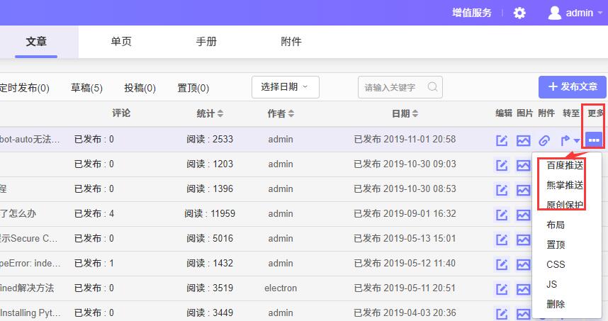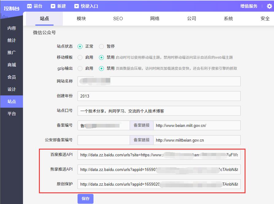 使用说明: 1.后台--站点--站点设置里,填写百度站长平台中提交链接的主动推送API 、熊掌号API、原创保护API; 2. 后台--站点--网络--域名设置里填写网站域名; 3.文章列表操作里点击‘百度推送’、‘熊掌推送’、‘原创保护’即可。 采用主动推送机制,一键将页面地址推送给百度,缩短爬虫抓取间隔,快速简便。 目前支持文章、博客、单页的推送。 注 : 您可提交所选熊掌号下绑定的任意站点的原创数据;