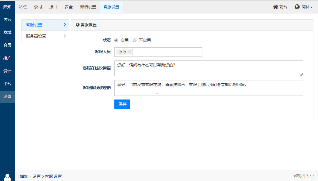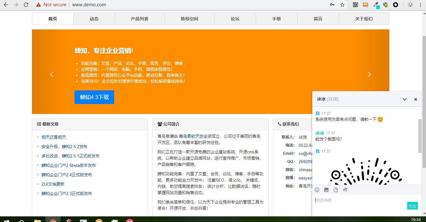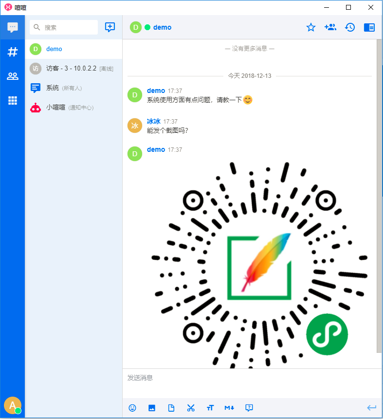 蝉知在线客服插件支持访客在网站前台发起聊天会话,与客服在线沟通,客服可以使用喧喧客户端回复访客,并且支持文件传输和图片传输。