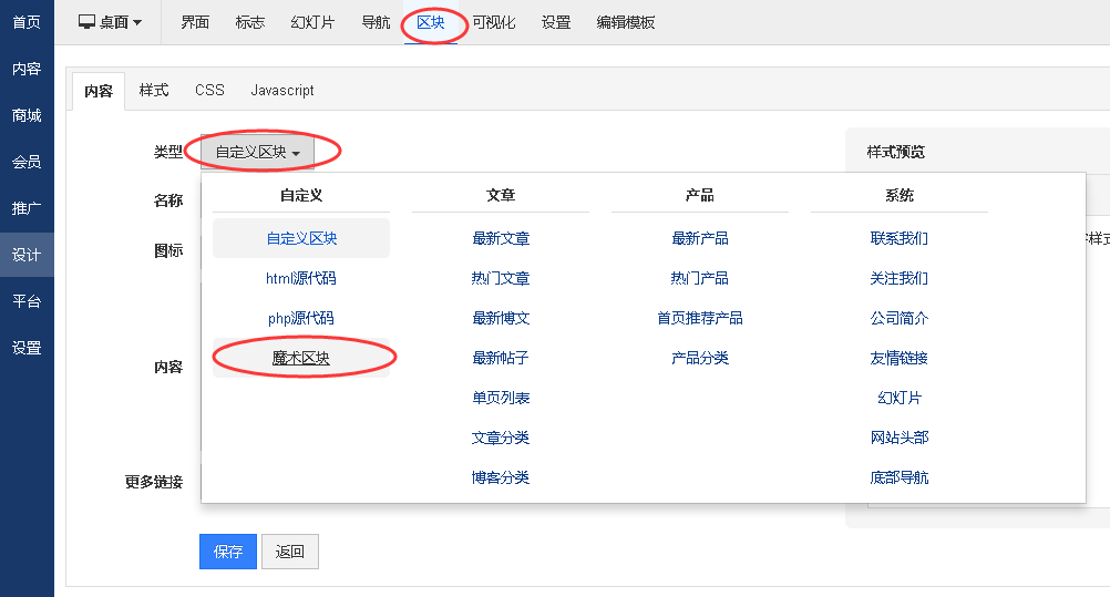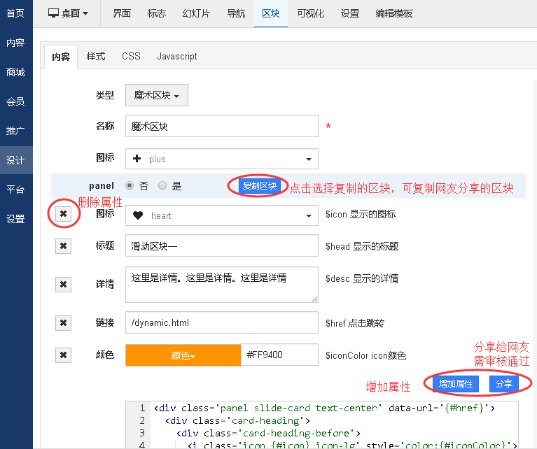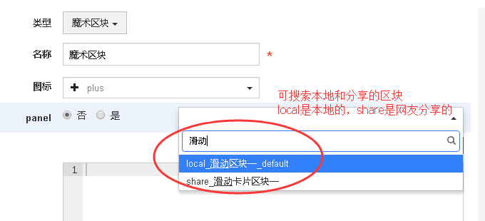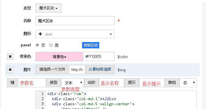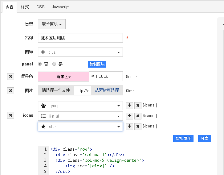 注意事项:魔术区块支持php代码运行,请加强后台密码强度。 使用说明: 1、选择魔术区块类型的自定义区块进行新建。 2、属性 属性名(键)需为英语字符,是属性的唯一ID,不能重复。 类型有 string(文本)、textarea(长文本)、image(图片)、color(颜色)、date(日期)、icon(图标)。 名称为属性的提示名。 提示为输入框的提示信息。 当选择为数组时会提供一个数组输入区。 3、可以使用php代码去调用一些文章等系统数据。 4、点击分享后会将区块提交到服务器,插件作者审核通过后出现在复制列表内。 5、在代码去可使用{#键}格式进行数据调用,如{#color};php代码中可以直接$键进行调用,如$color。 ![]()