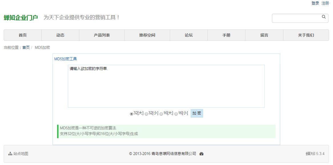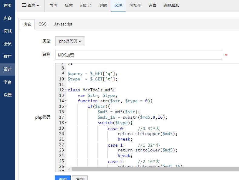 1.创建区块。蝉知系统的界面布局是以区块为单位的,我们需要将我们想展现的页面内容整理成一个或多个区块。本示例很简单,就一个MD5机密功能,制作一个该区块即可: