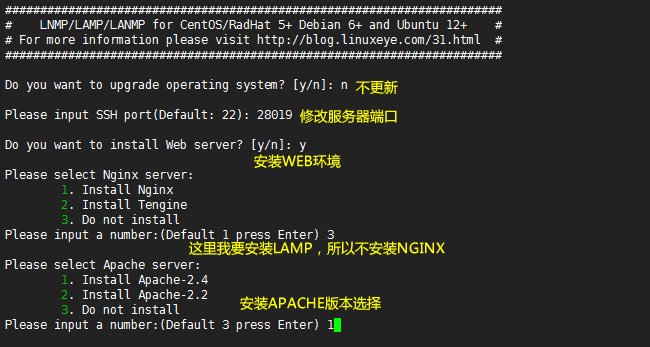 开始过程我们看到上图,官方建议不更新系统,那我们就不更新。我们可以直接在安装脚本过程中直接修改 ROOT端口,这个非常不错,要不我们在服务器安全事项处理的时候也需要修改端口,不要用默认的 22。 WEB服务器的安装,因为我们要安装 LAMP环境,所以 NGINX不安装, APACHE安装自己希望的版本,我这里安装 2.4。